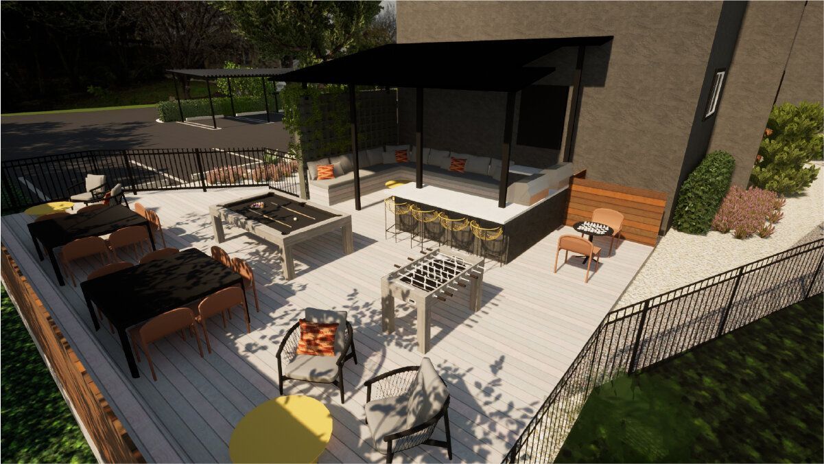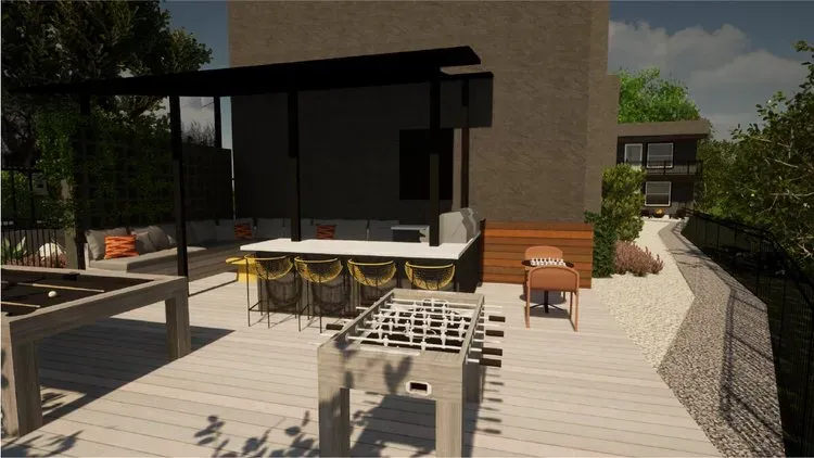 - Community outdoor kitchen, BBQ grilling station, fire pit, and sun deck